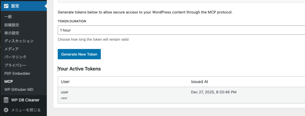 管理画面から Settings > WordPress MCP > Authentication Tokens に移動し、トークンの有効期限を設定して Generate します。発行されたトークンを控えて、後でクライアントで使用します。